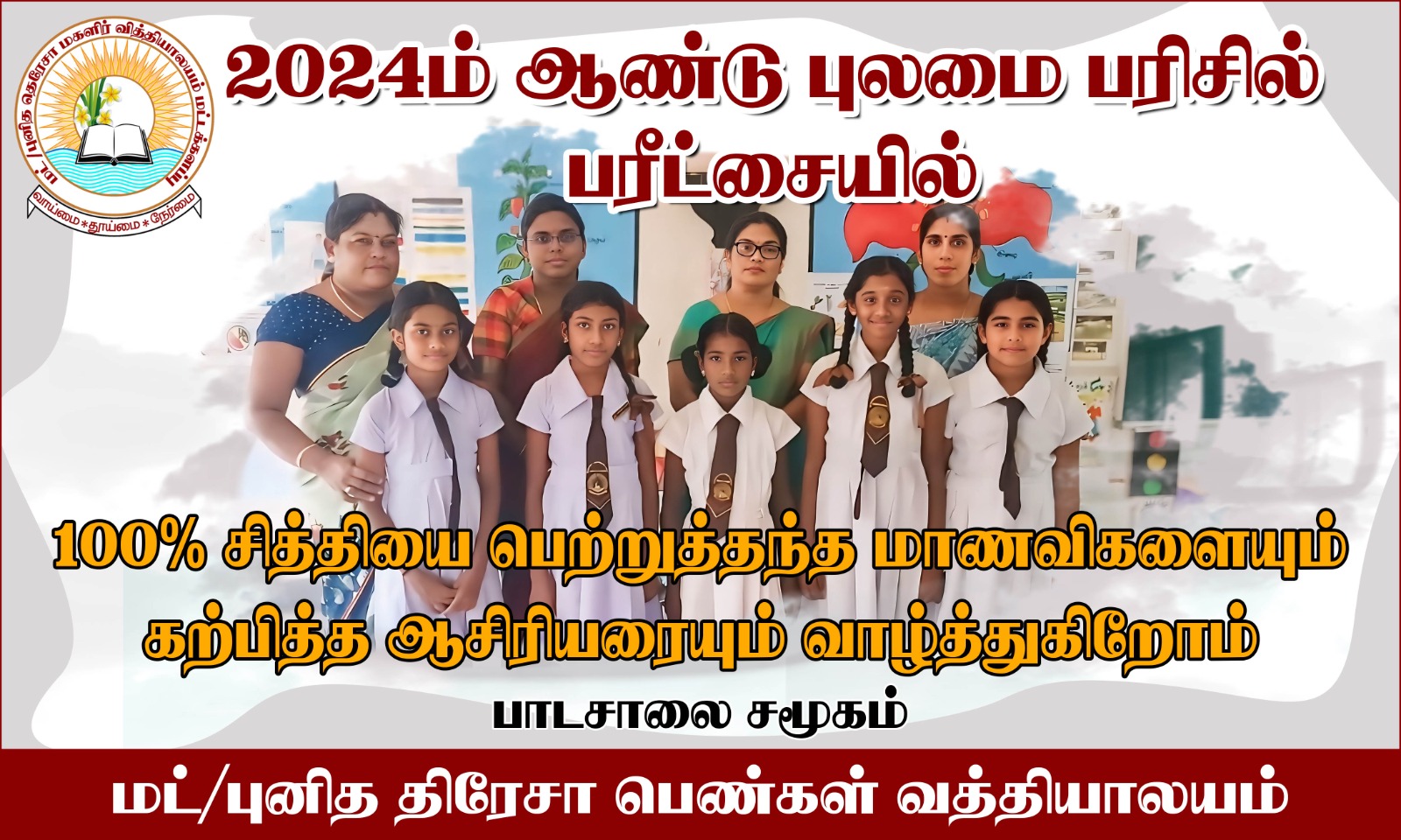 I assumed duties as Principal of BT/St.Theresa's Girls' Vidyalayam School on 08.02.2023. Our school is engaged in the work of creating women with excellent personalities with diverse values, adopting the ideas of Mother Theresa. Female students are guided to become high thinkers in order to attain Sri Lanka's national educational goals and basic competencies. In ensuring these, our school teachers and non-academic staff are fully dedicated and working as one team. The school development executive committee, school development association and parents are supporting this. Girls from three child care centers are educated here and most of the parents live below the poverty line. Thus, contributions from donors are expected in school activities. The achievement level of the students in public examinations is high and the school has achieved many achievements in co-curricular activities. The continuous encouragement of Mrs. Sujatha Kulendrakumar, Zonal Director of Batticaloa Zone , and the supervision and advice of Deputy Directors of Education , Manmunai North Divisional Director of Education .Assistant Directors of Education , In-service Advisors and Zonal Education Officers are the basis for the school working towards national level achievements. We are also looking forward to all the suggestions and contributions of all stakeholders to become more successful and more popular. Mrs. Thushyanti Jayavathanan Principal (SLPS-II)